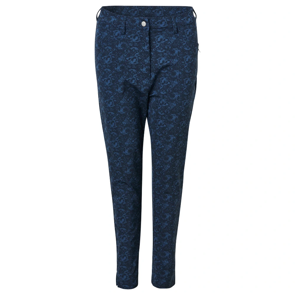 Elite Graphic 7/8 trousers are made of a functional material in 4-way stretch that is also very breathable. The fabric is allover printed and has drycool and wicking effects. Front zipper, two front and two back pockets. Belt loops around waist allows a belt. Feminine fit with high waist and a slightly shorter inseam length that works just as well on course as off course.