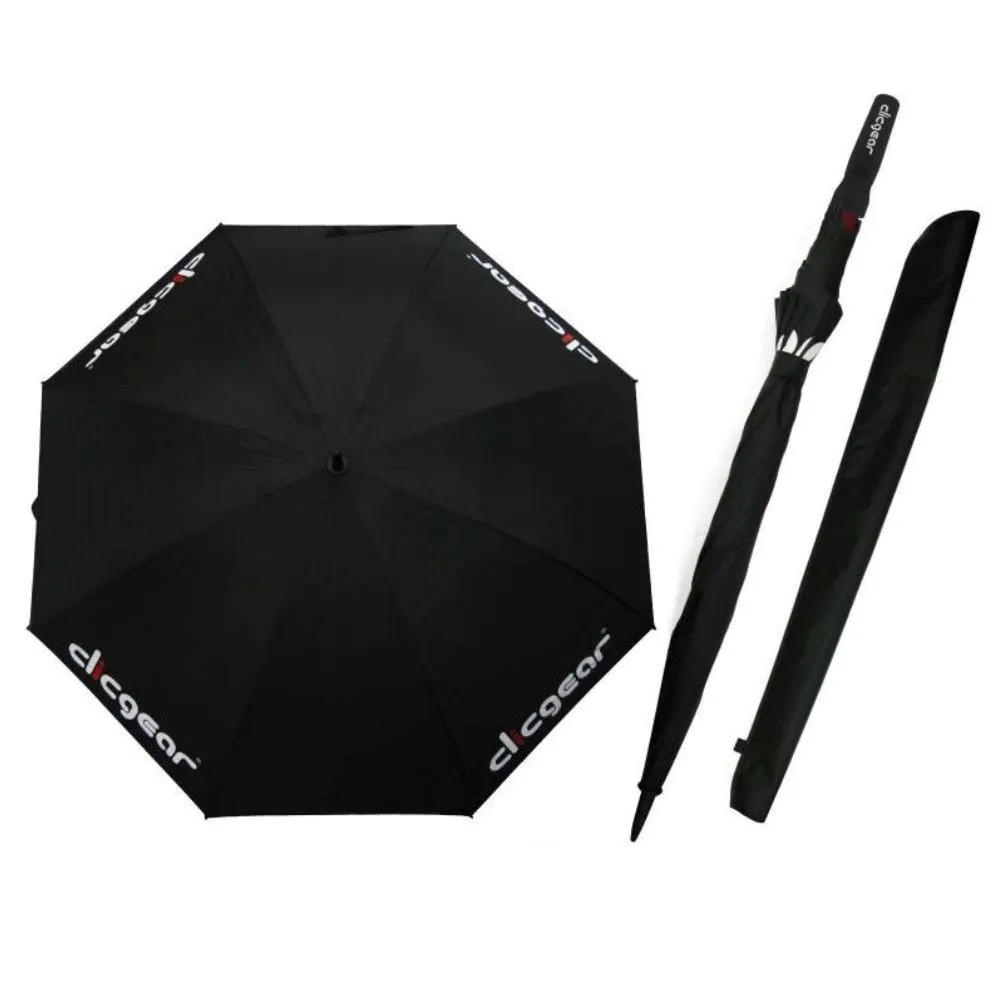 The Clicgear® Umbrella with a 68″ over-sized double canopy, the Clicgear Umbrella is designed to give maximum protection. Custom molded handle designed to fit perfectly in all Clicgear umbrella holder systems. The Umbrella is made with waterproof and clear UV coated nylon. It’s perfect for the sun or rain and fits all models of Clicgear Cart, as well as most other brands of golf push carts with umbrella holders.