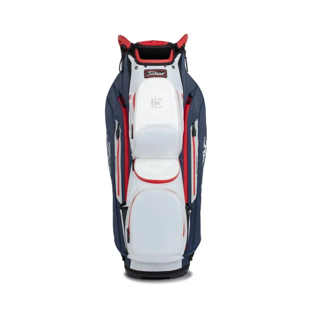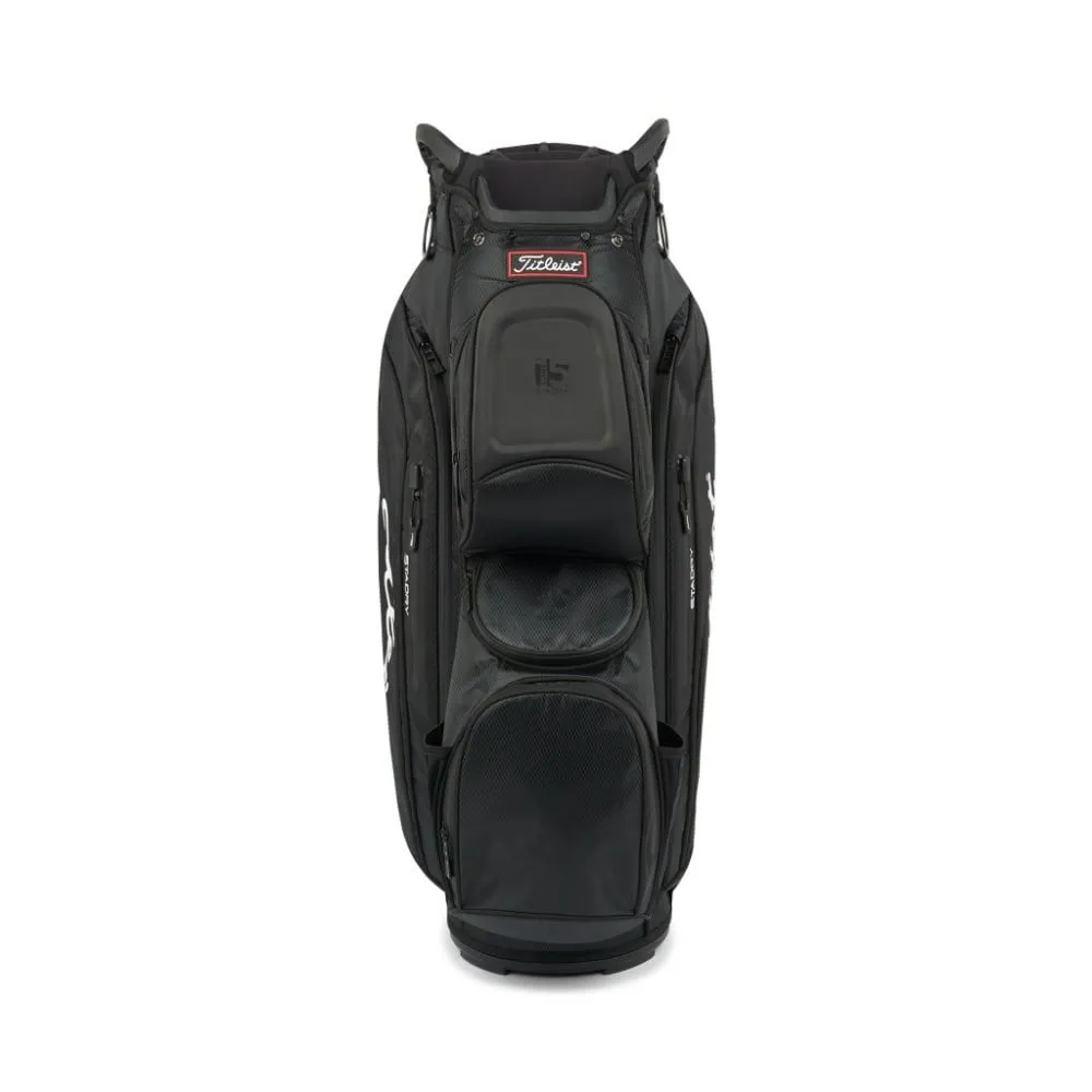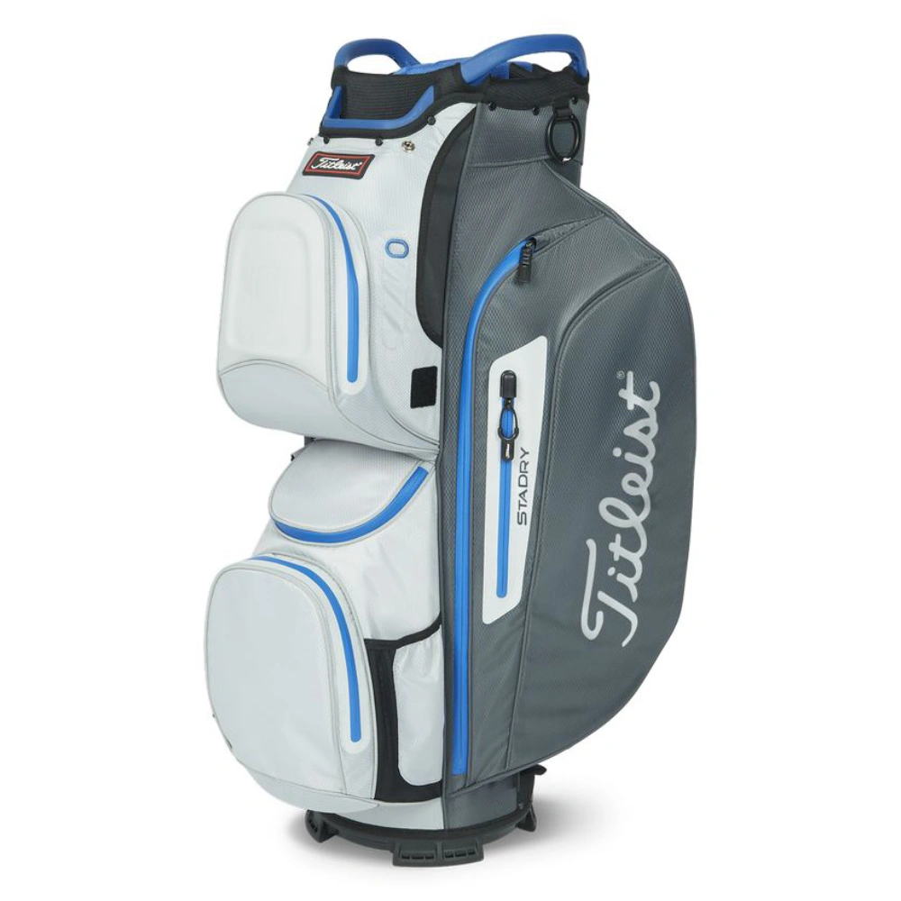 A larger, premium performer from Titleist, the StaDry 15 Cart Bag is the ideal choice for the player who most often uses a golf trolley and is looking for a fully waterproof design with maximum club organisation. It works exceptionally well on an electric trolley or with a push/pull trolley. Featuring 9 zippered pockets that are all accessible while the golf bag is on the trolley. These include apparel pockets, valuables pockets, accessory pockets & more. A new integrated putter well ideal for easy access to the most used club in the bag. Other key features include a club & graphite-friendly velour 15-way divider top with 15 full-length dividers which not only protects your clubs but gives exceptional organisation for the bag. Constructed from waterproof seam-sealed StaDry material, the bag is 100% waterproof.