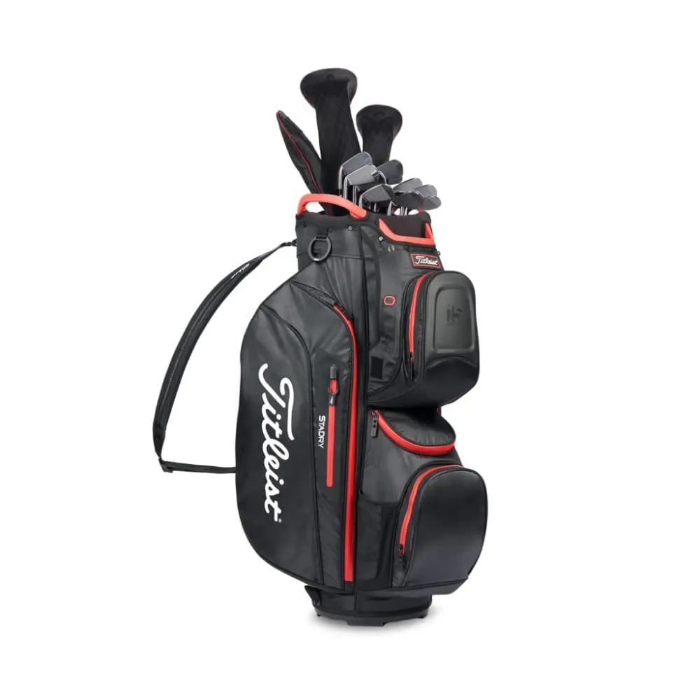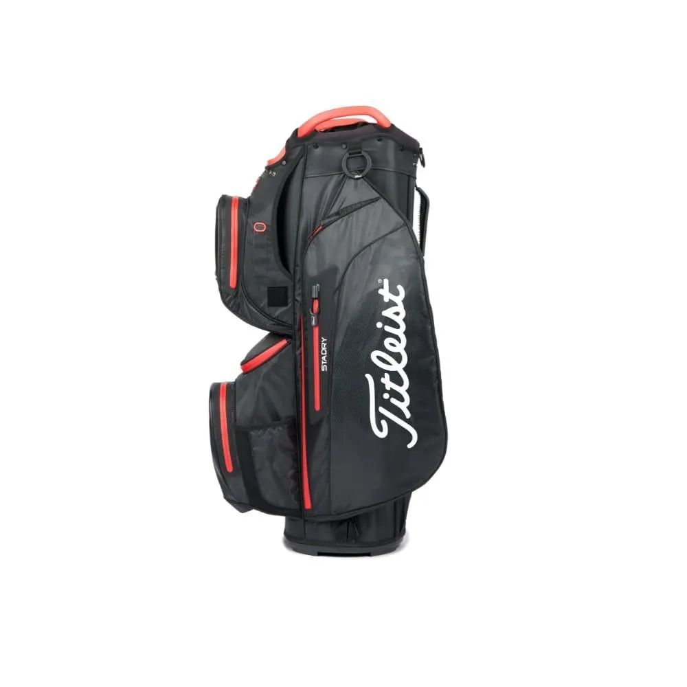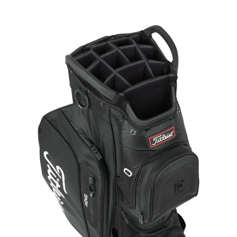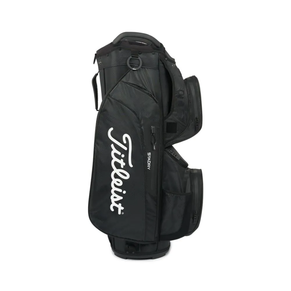 A larger, premium performer from Titleist, the StaDry 15 Cart Bag is the ideal choice for the player who most often uses a golf trolley and is looking for a fully waterproof design with maximum club organisation. It works exceptionally well on an electric trolley or with a push/pull trolley. Featuring 9 zippered pockets that are all accessible while the golf bag is on the trolley. These include apparel pockets, valuables pockets, accessory pockets & more. A new integrated putter well ideal for easy access to the most used club in the bag. Other key features include a club & graphite-friendly velour 15-way divider top with 15 full-length dividers which not only protects your clubs but gives exceptional organisation for the bag. Constructed from waterproof seam-sealed StaDry material, the bag is 100% waterproof.